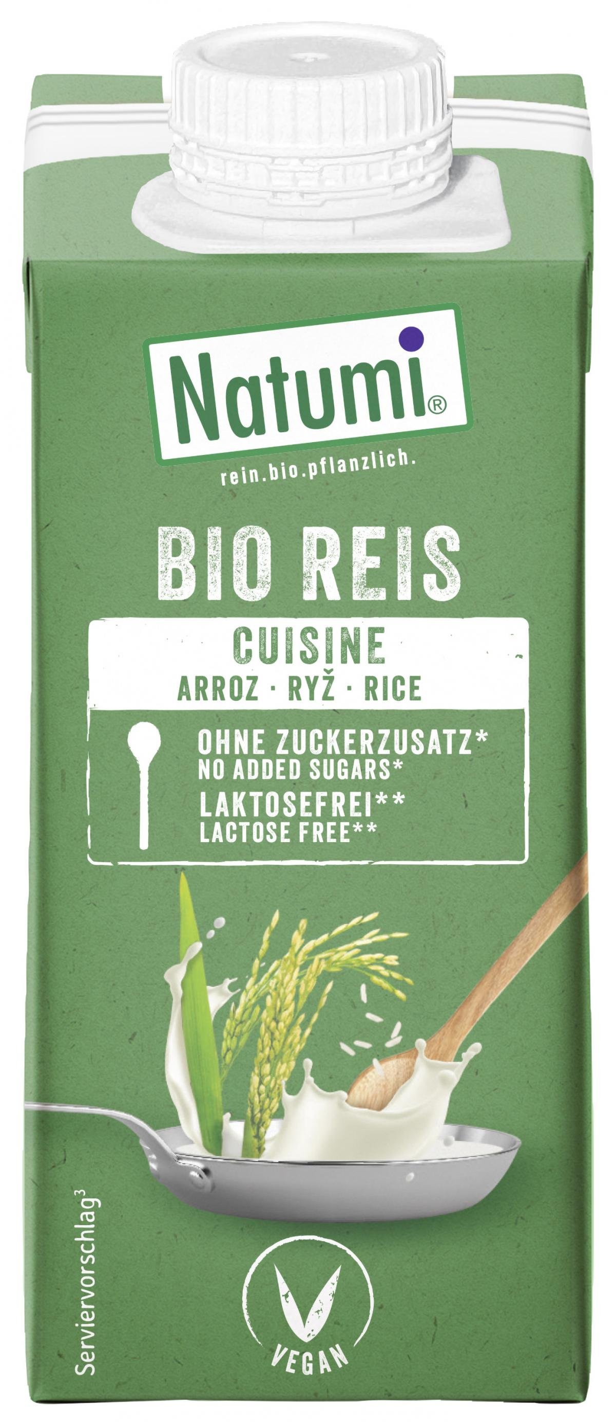 Natumi Reis Cuisine, pflanzliche "Sahne" auf Reisbasis. Lecker sahnig im Geschmack, extra crmig und vielseitig. Zum Kochen, Bakcen und Verfeinern, für Desserts und Eis.