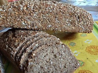 Wasser, Dinkelvollkornschrot*, Dinkelvollkornflocken*. 3 Stufen Dinkelvollkornsauerteig*, gekochte Dinkelkörner*, Meersalz