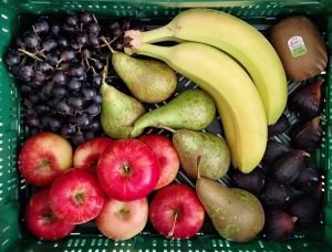 immer Bananen, wöchentlich wechselnde Apfelsorten und Obst der Saison.