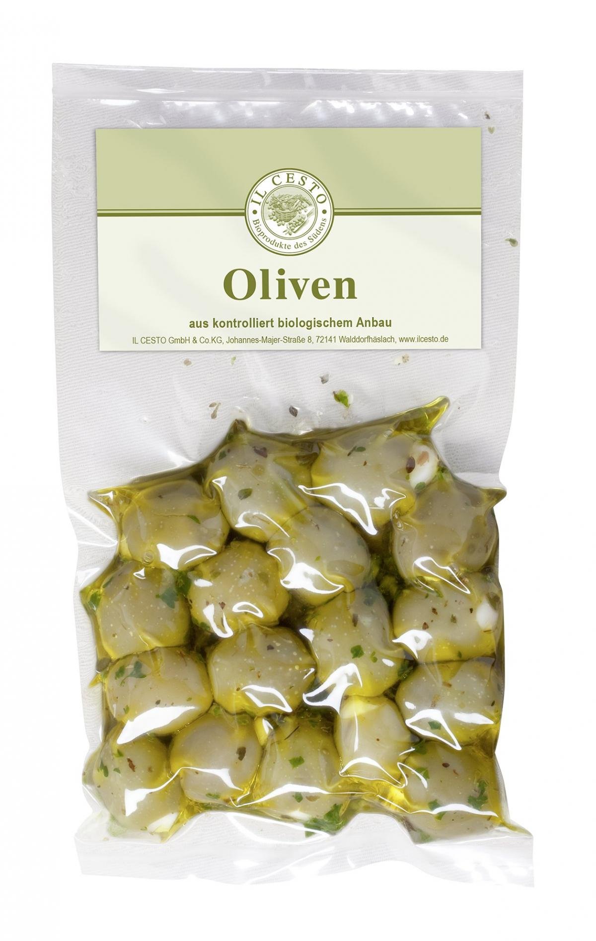 Oliven grün* (85,7%) (Knoblauch*, Meersalz), Rapsöl* (13%) (kaltgepresst), Knoblauch*, Petersilie*, Oregano*
