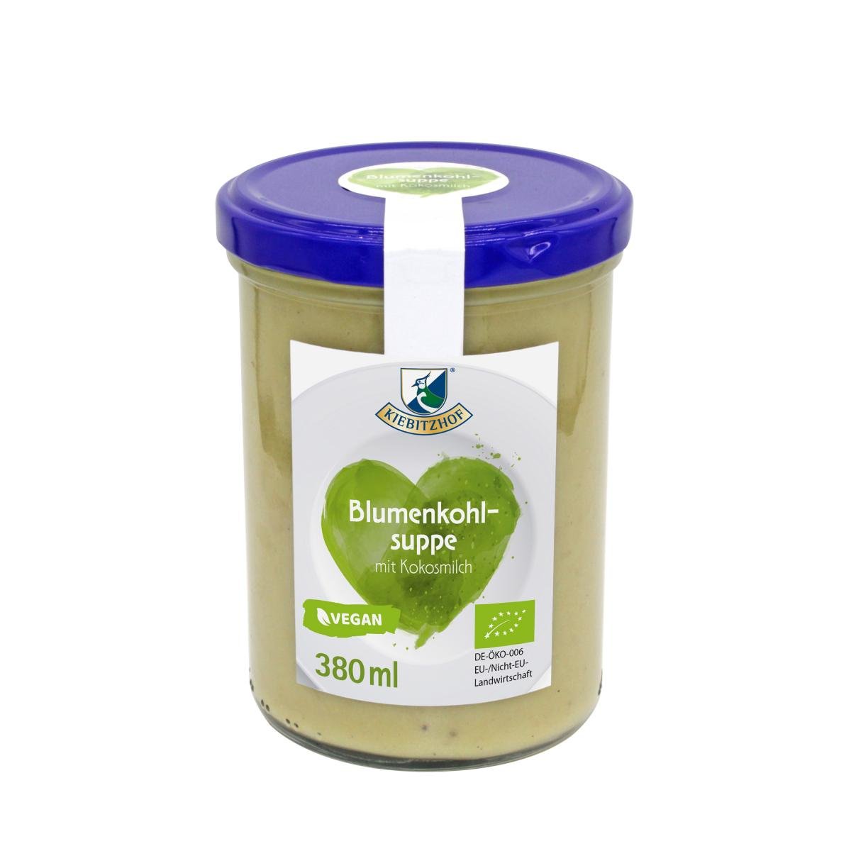 Milder Blumenkohl mit Kartoffeln, abgerundet mit Kokosmilch und verfeinert mit Zitronensaft. Natürliches Aroma durch Verzicht auf Geschmacksverstärker und Zusatzstoffe. Vegan, laktosefrei und glutenfrei.