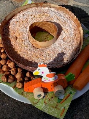 DINKELvollkornmehl, BUTTER, Rohrohrzucker, EIER, Möhren, gemahlene HASELNÜSSE, Wasser, Backpulver (Weinstein), Dekor: Puderzucker, Zitronensaft