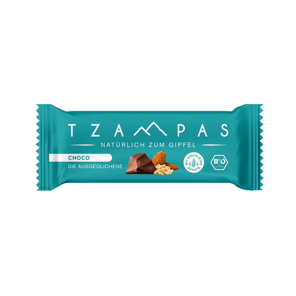 Der TZAMPAS Choco Bar eignet sich hervorragend als Sportriegel, Zwischenmahlzeit und gesunder Fitness Snack für zwischendurch.